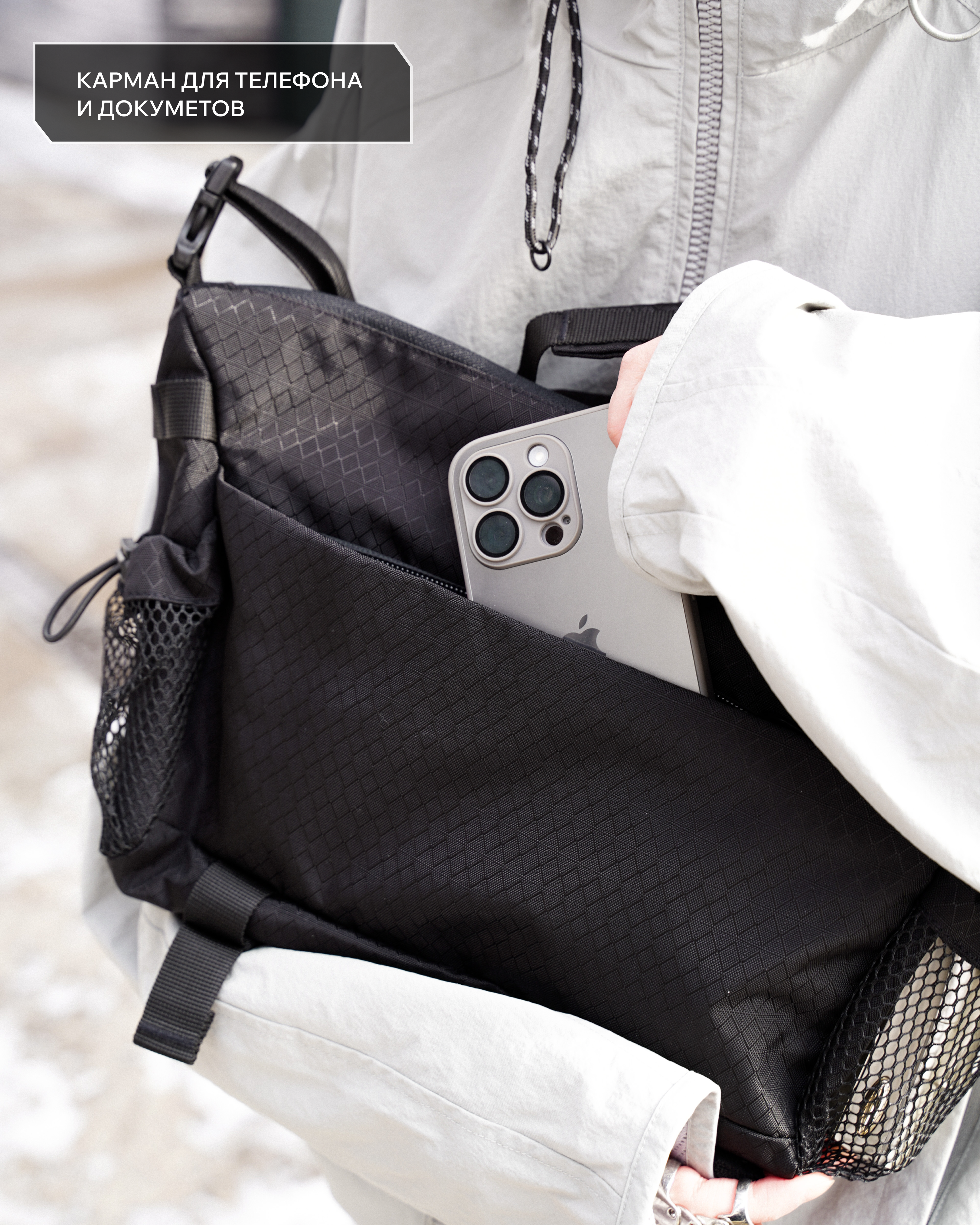 • Отделение на спинке для телефона или документов